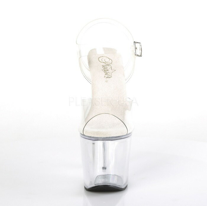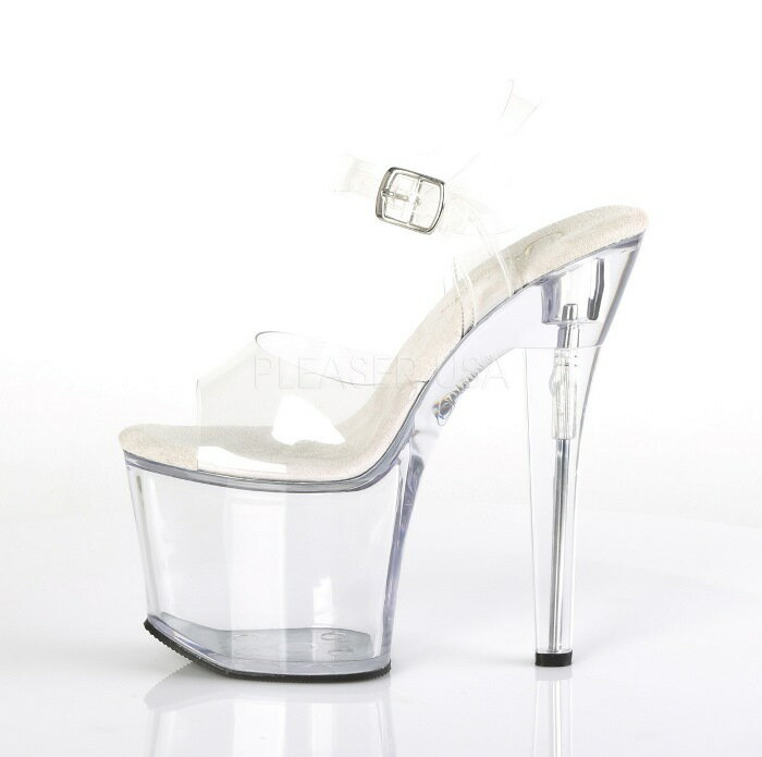 Pleaser プリーザー サンダル 18cm ヒール ハイヒール ピンヒール クリアヒール 透明 クリア スケルトン 白 ホワイト 厚底 超厚底 アンクルストラップ ベルト 大きいサイズ 靴 シューズ セクシー ポールダンス コスプレ 女装 ダンサー RADIANT-708 RAD708/C/M 取寄