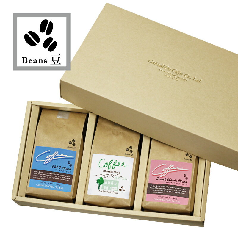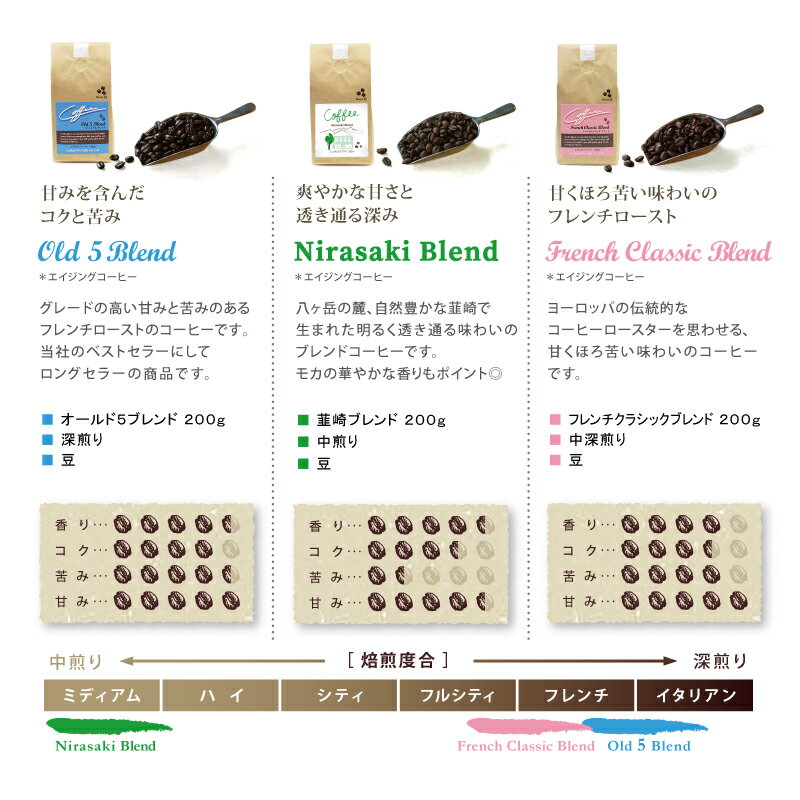コクテール堂人気No,1甘みを含んだコクと苦み〈オールド5ブレンド〉 爽やかな甘さと透き通る深み、コクテール堂の源流で生まれたファクトリーブレンド〈韮崎ブレンド〉 甘くほろ苦い味わいのフレンチロースト〈フレンチクラシックブレンド〉 個性豊かな3種類のブレンドコーヒーをご用意しました。