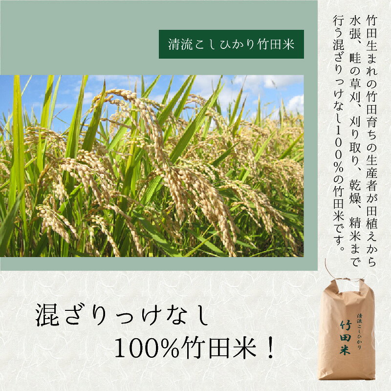 竹田生まれの竹田育ちの生産者が田植えから水張、畦の草刈、刈り取り、乾燥、精米まで行う混ざりっけなし100%の竹田米です。