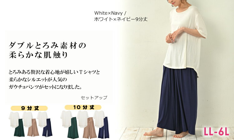 大きいサイズ レディース 半袖トップス 半袖Tシャツ ガウチョパンツ ワイドパンツ ロングパンツ 9分丈 10分丈 ロング丈 ミモレ丈 ウエストゴム とろみ素材 とろみ生地 さらさら素材 透け感 白Tシャツ 上下セット アンサンブル 単品使い 人気アイテムセット リラックスウェア リラックスパンツ ルームウェア 部屋着 カジュアル ナチュラル エスニック 大人 きれいめ かわいい コーデ 着こなし おすすめ 女性 30代 40代 50代 2021 白 緑 紺 春 夏 秋 LL 3L 4L 5L 6L 13号 15号 17号 19号 21号 jj-ssa-eb0003ダブルとろみ素材の極上着心地。